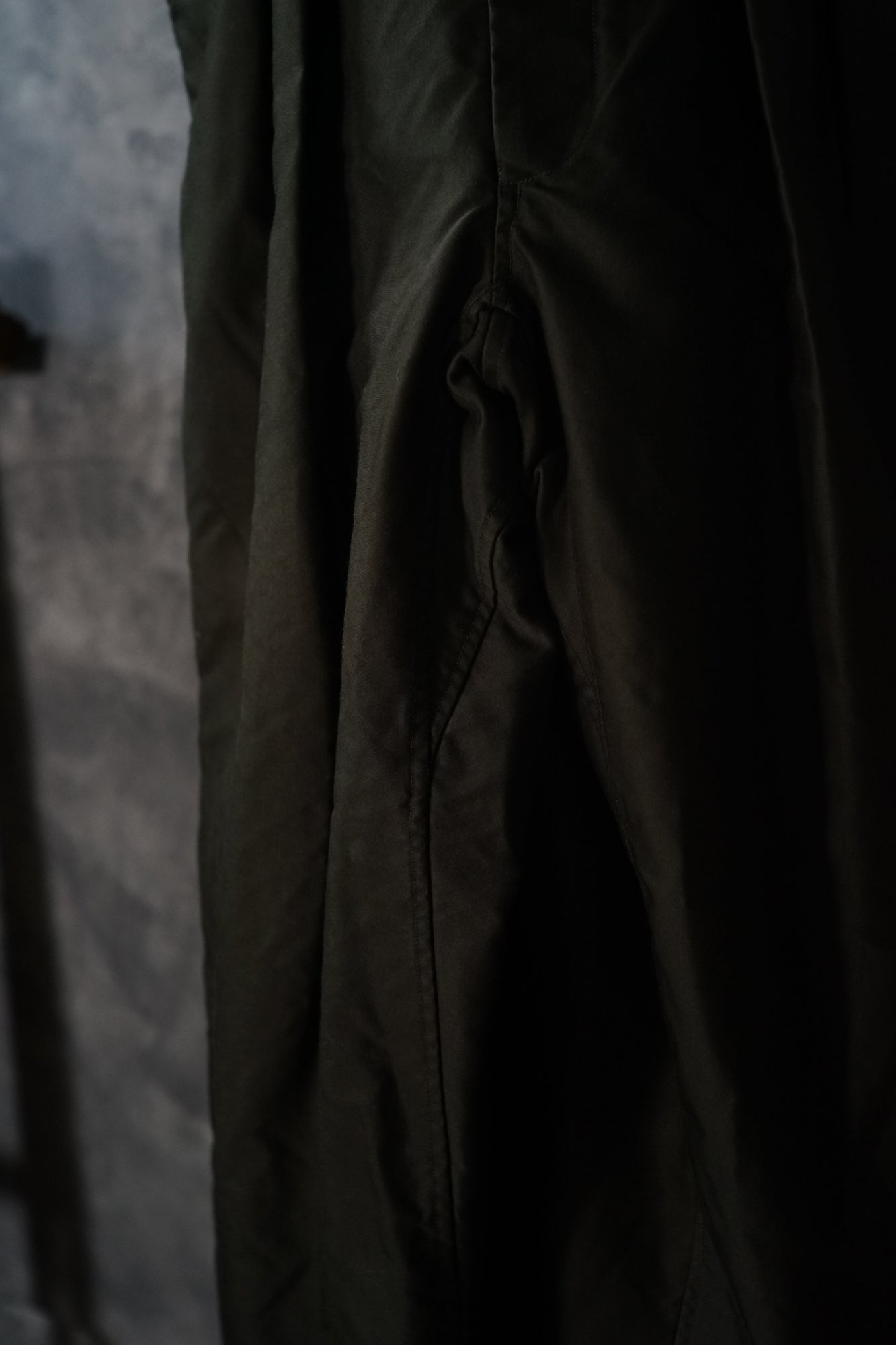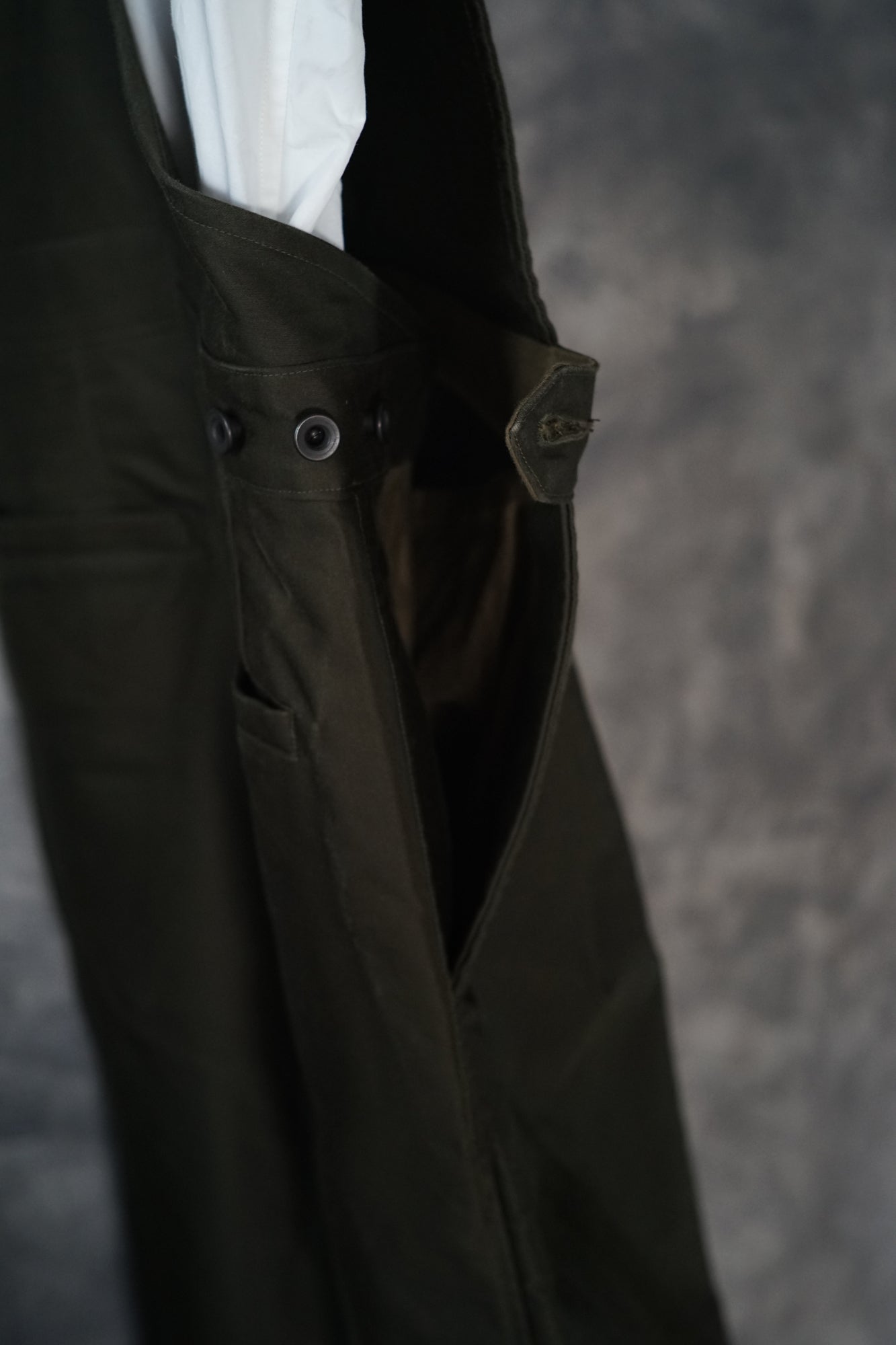 Overalls are an important item that we consider to be an icon of workwear, and we continue to update them little by little each time. The theme of this design is not too casual, so the front has two tucks in the style of wide pants. The material is moleskin woven from Egyptian Giza cotton, which is said to be one of the three major cottons in the world. The color is neither black nor work blue, but khaki, which is close to black. I'm really looking forward to seeing how it will develop as I continue to wear it. *Please note that the item has already been washed once in a household washing machine, so there may be some scratches in some places.
