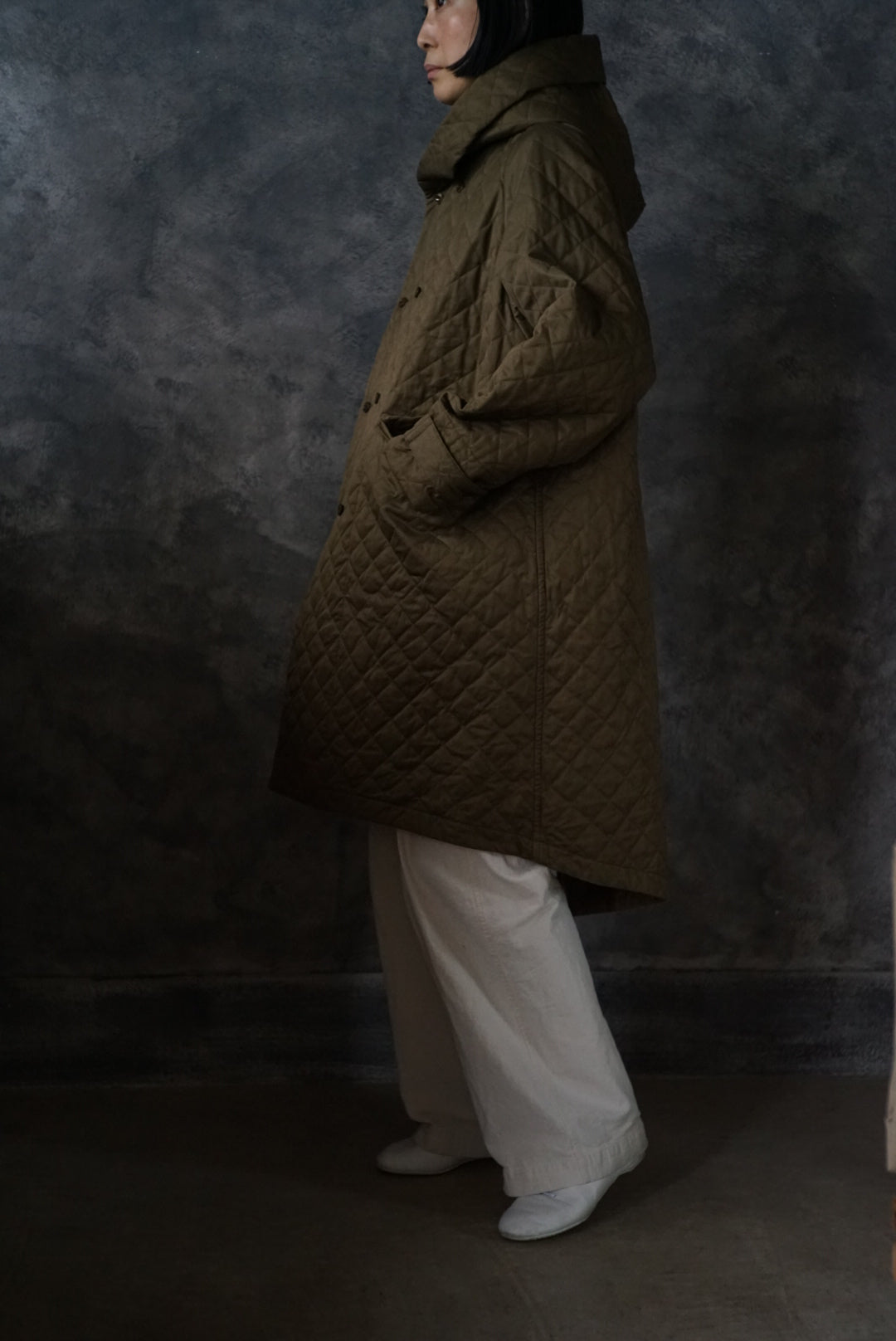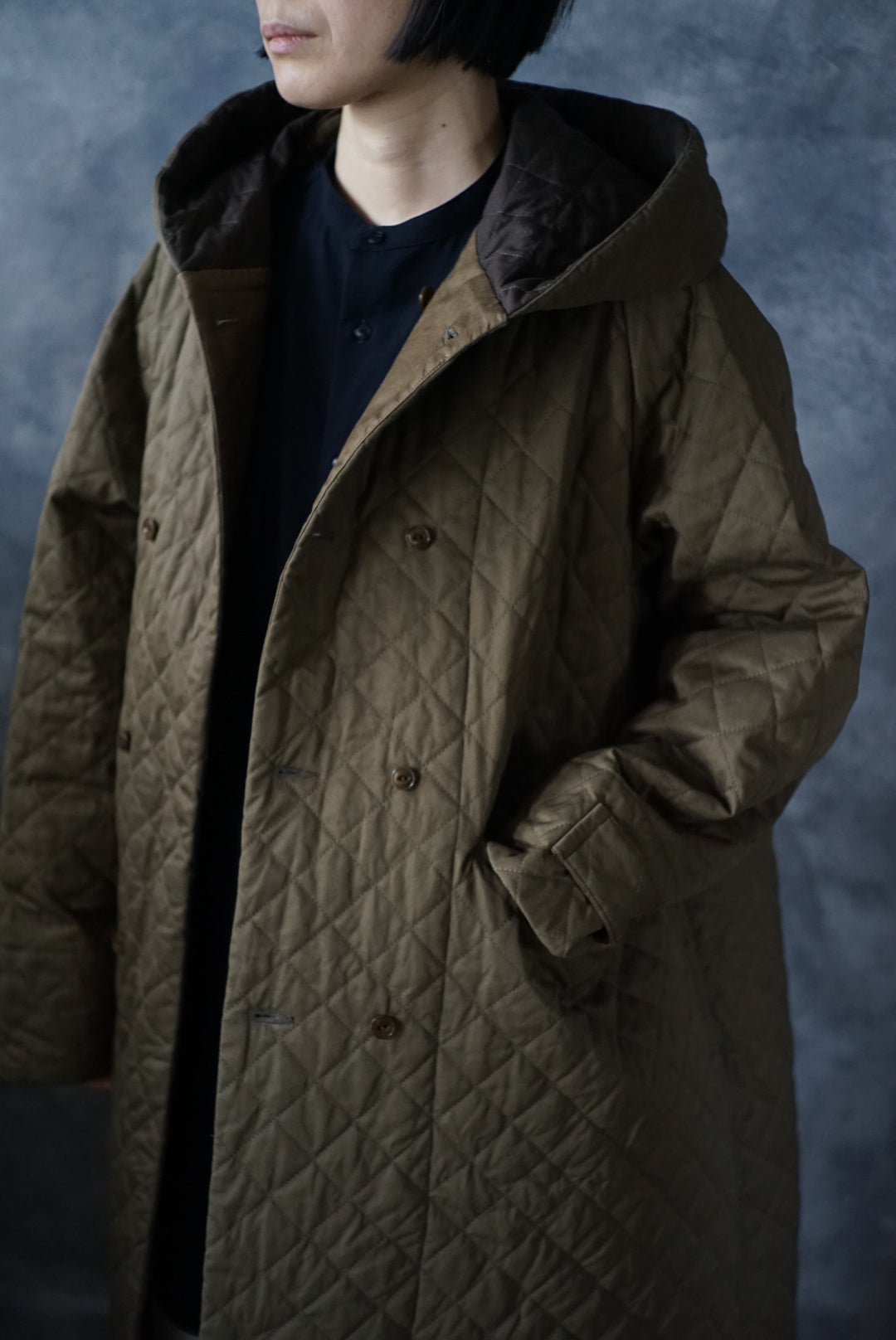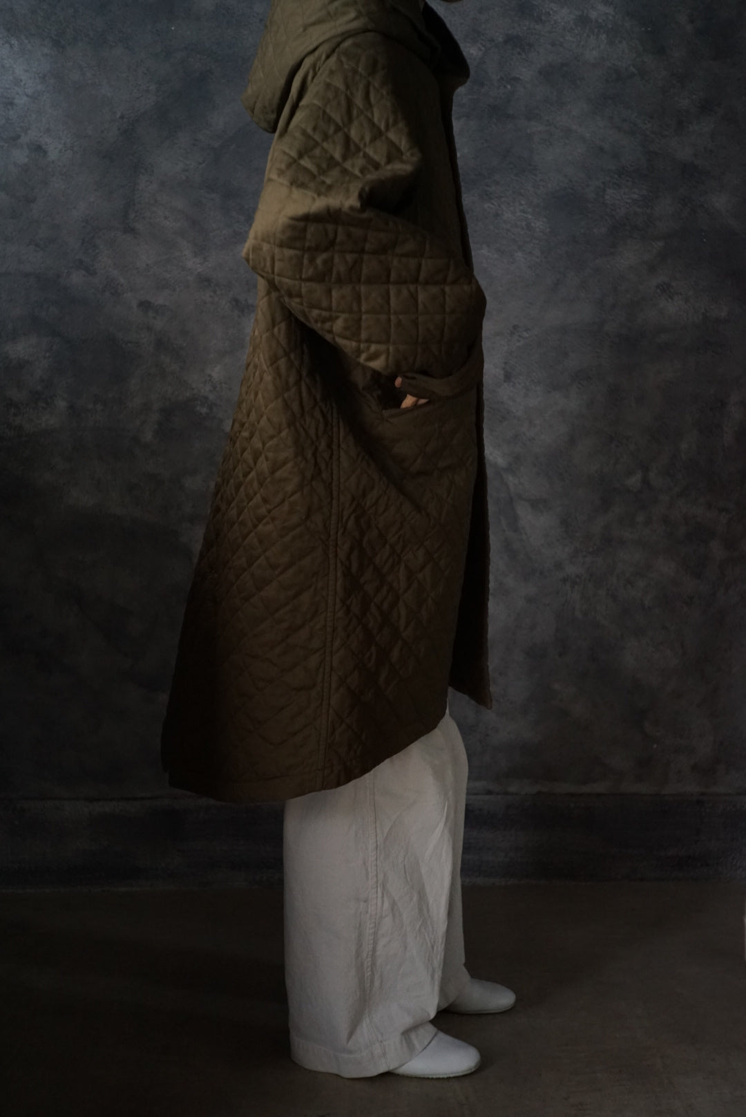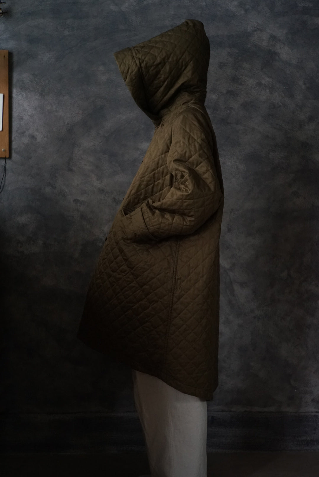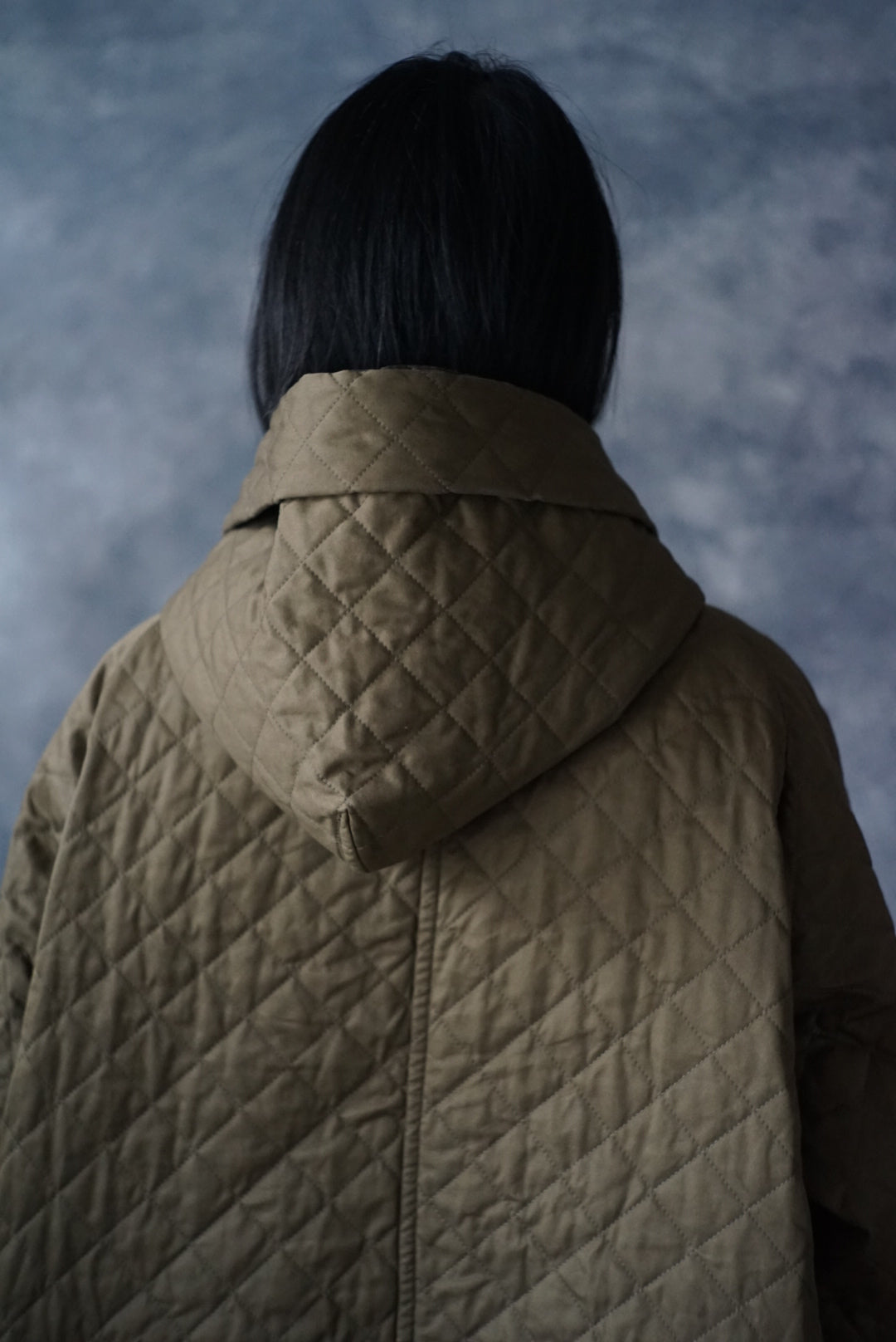 今まで定番で展開していたフードコートの表地をキルティング生地に変えたところ防寒性はバッチリだったのですが、やはり重みを感じるアウターになってしまい裏地を付けない1枚物にしようと作成し始めたのがこちらの型です。