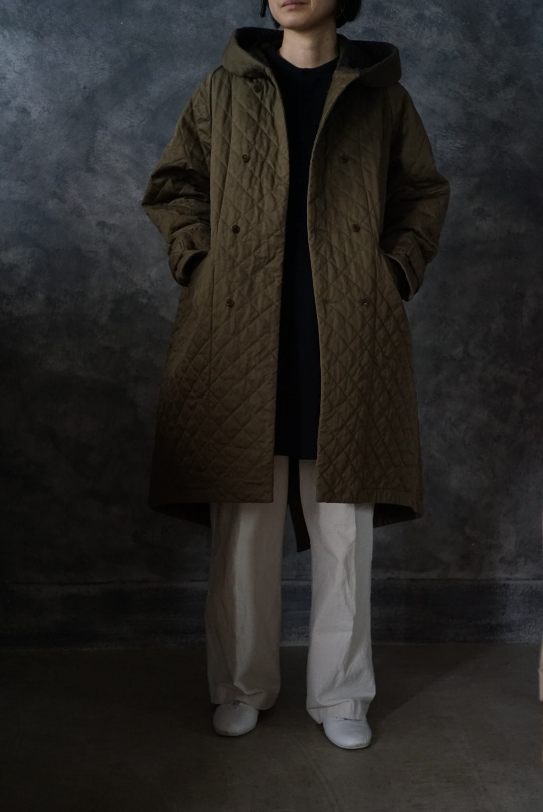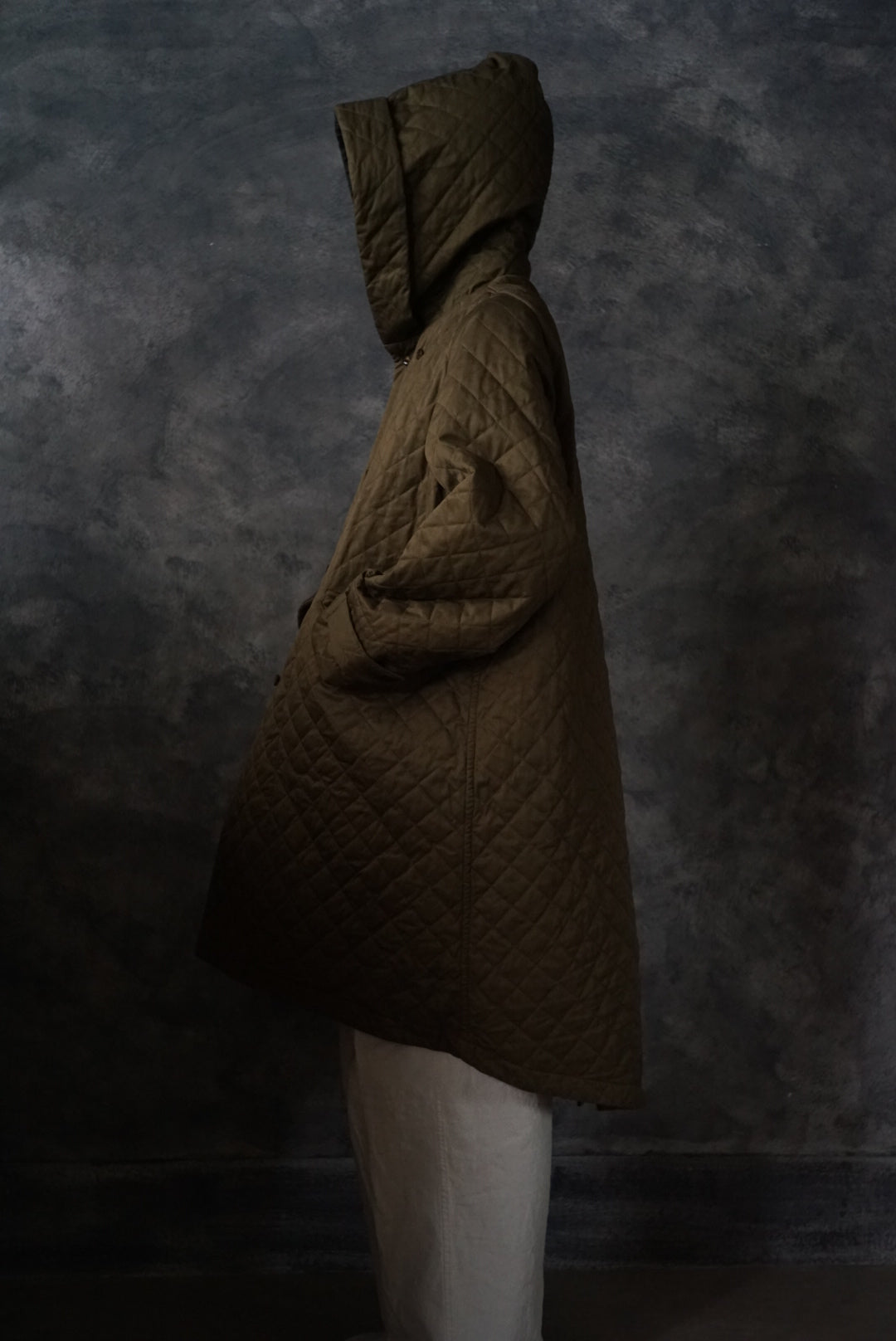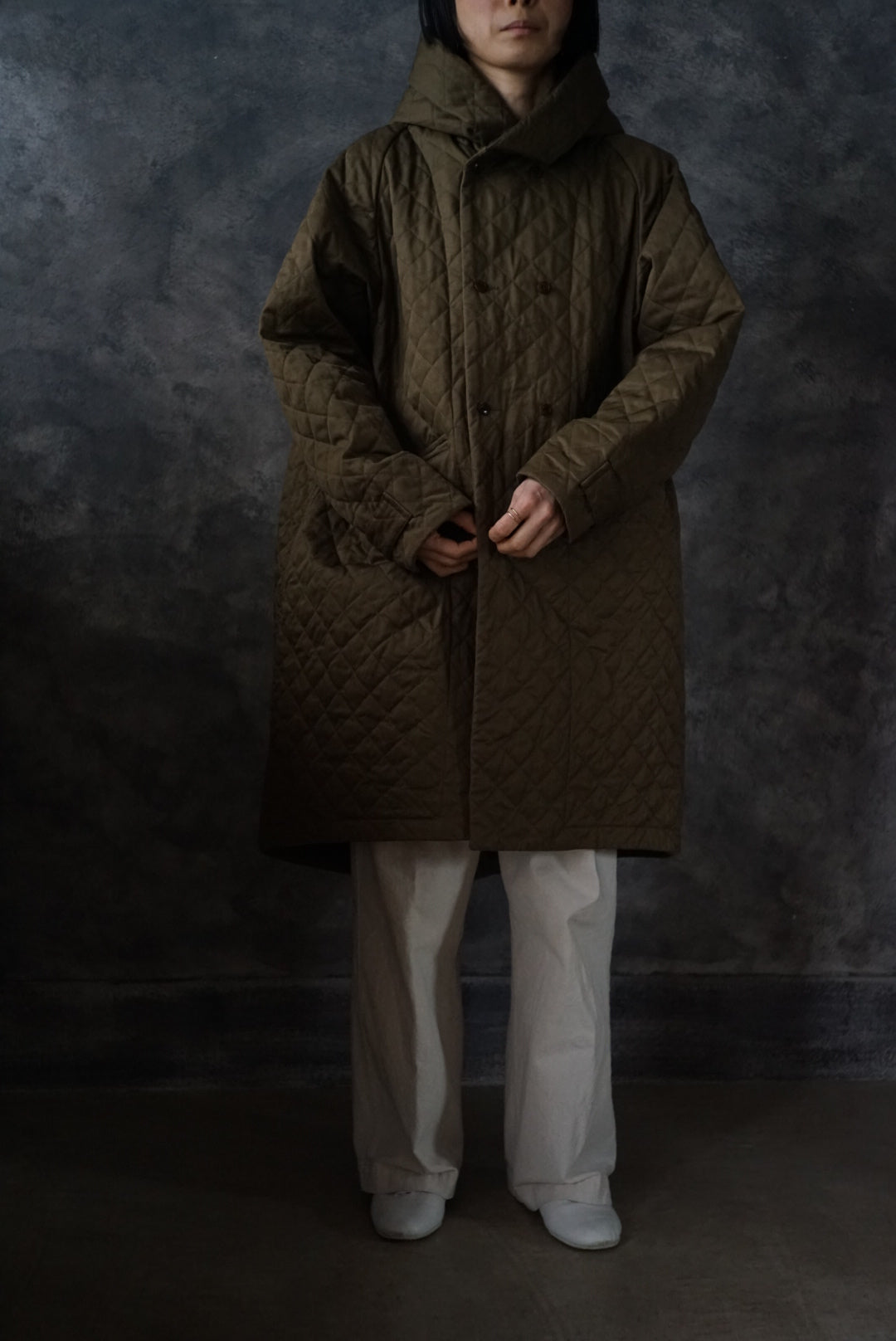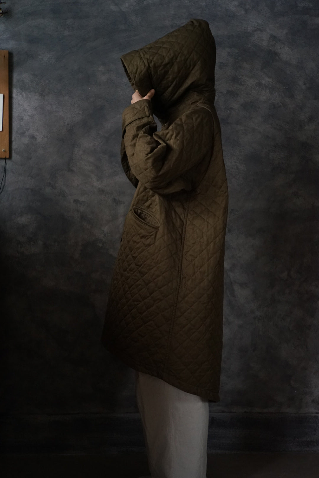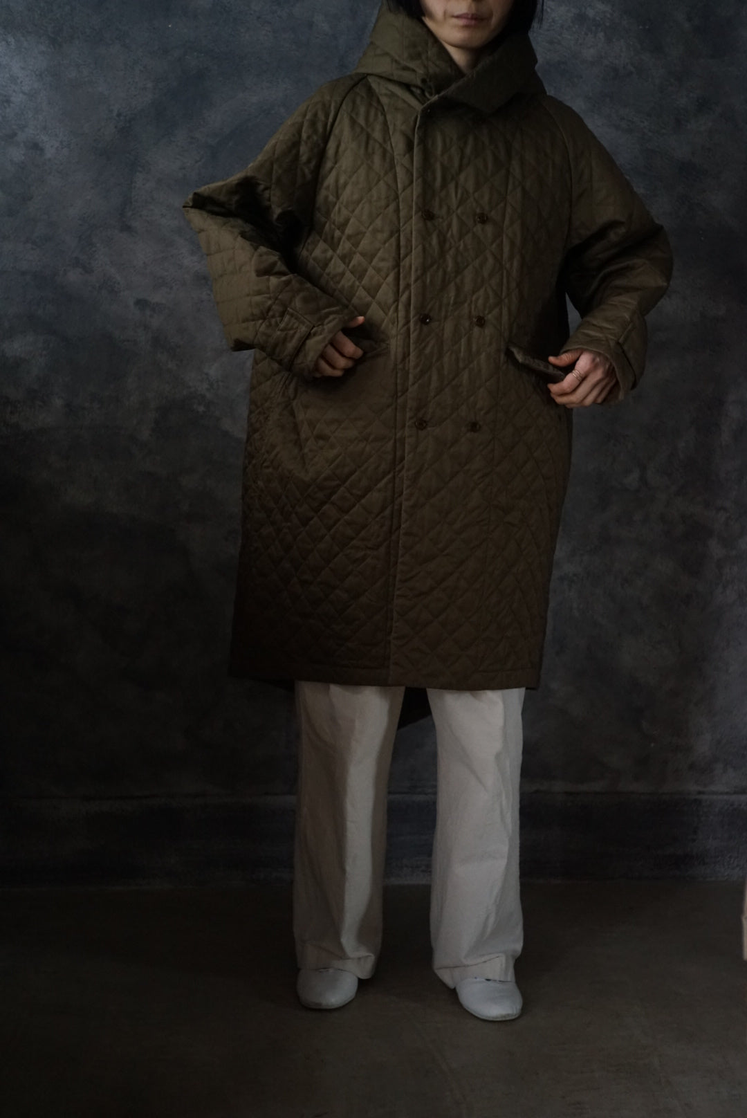 今まで定番で展開していたフードコートの表地をキルティング生地に変えたところ防寒性はバッチリだったのですが、やはり重みを感じるアウターになってしまい裏地を付けない1枚物にしようと作成し始めたのがこちらの型です。