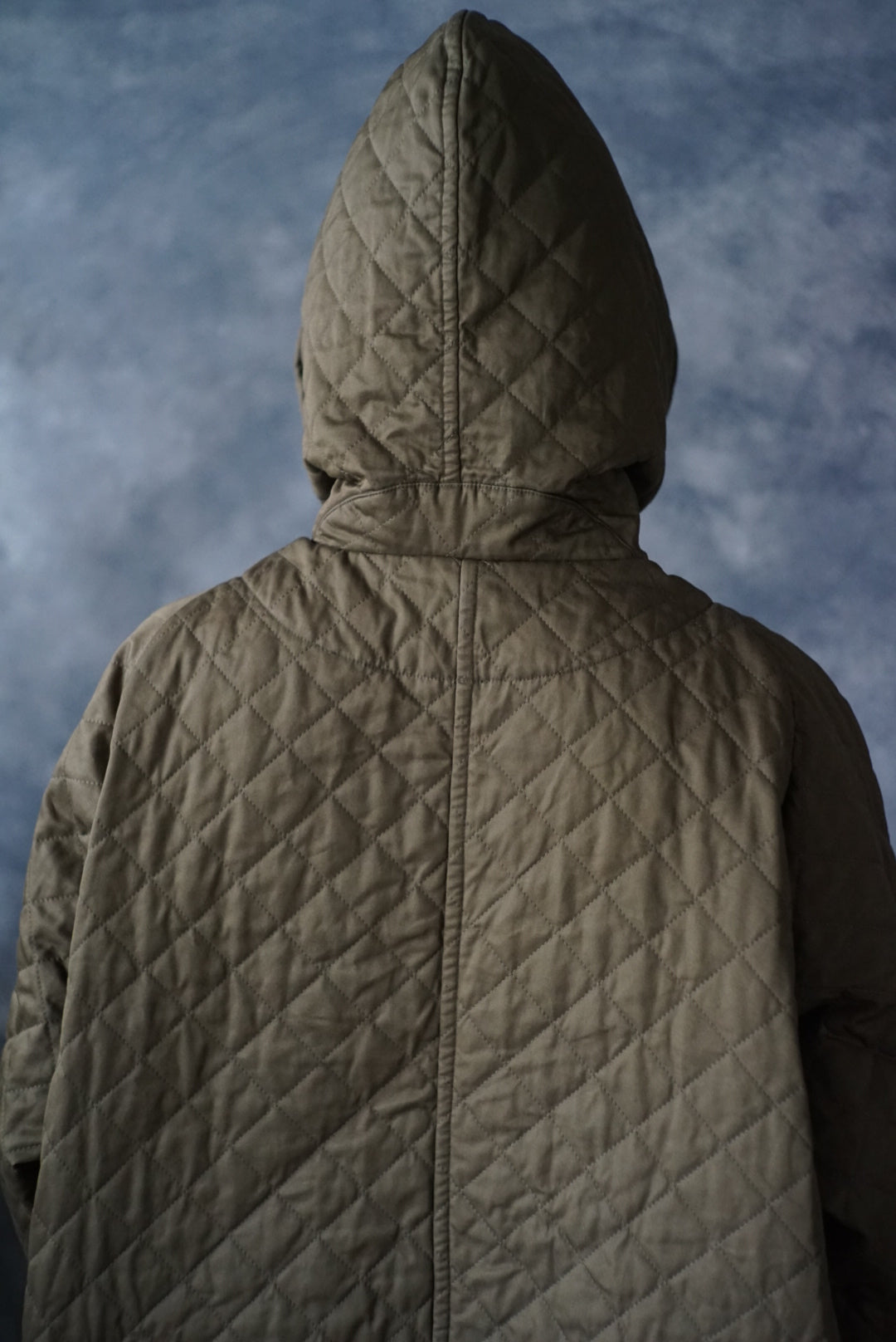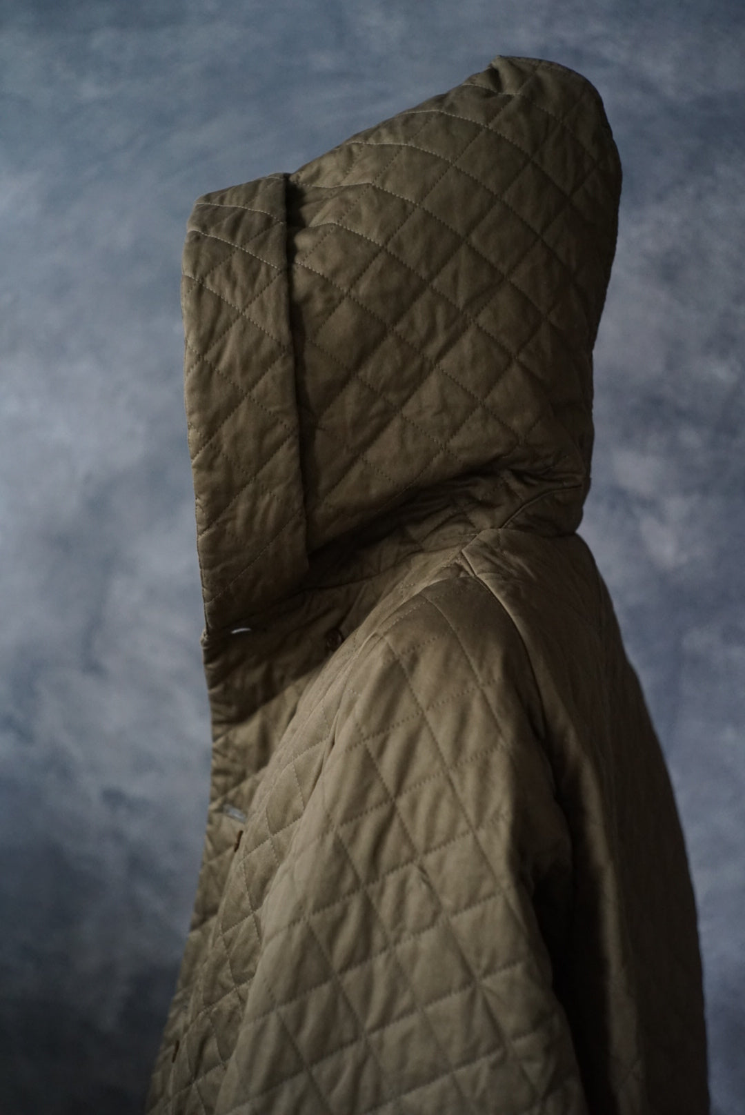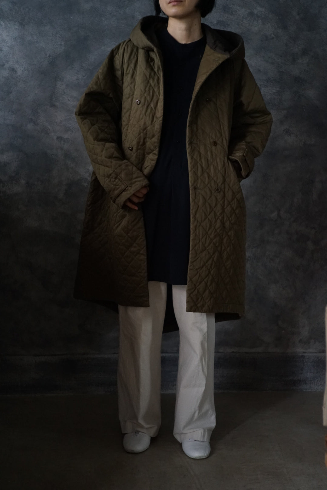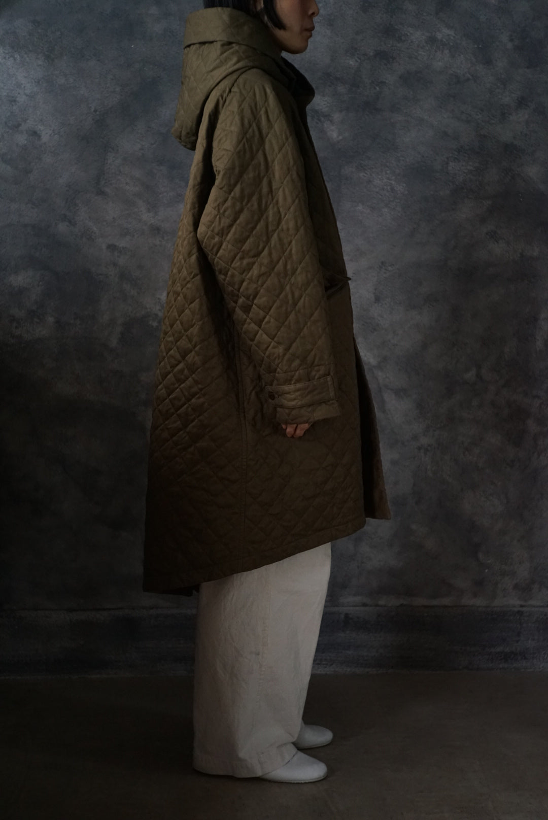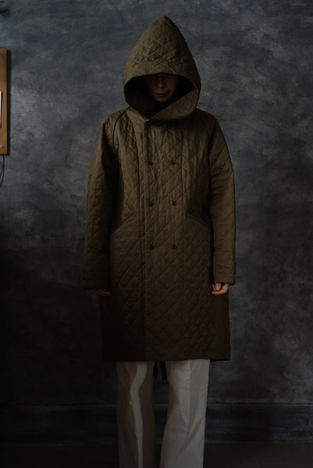今まで定番で展開していたフードコートの表地をキルティング生地に変えたところ防寒性はバッチリだったのですが、やはり重みを感じるアウターになってしまい裏地を付けない1枚物にしようと作成し始めたのがこちらの型です。