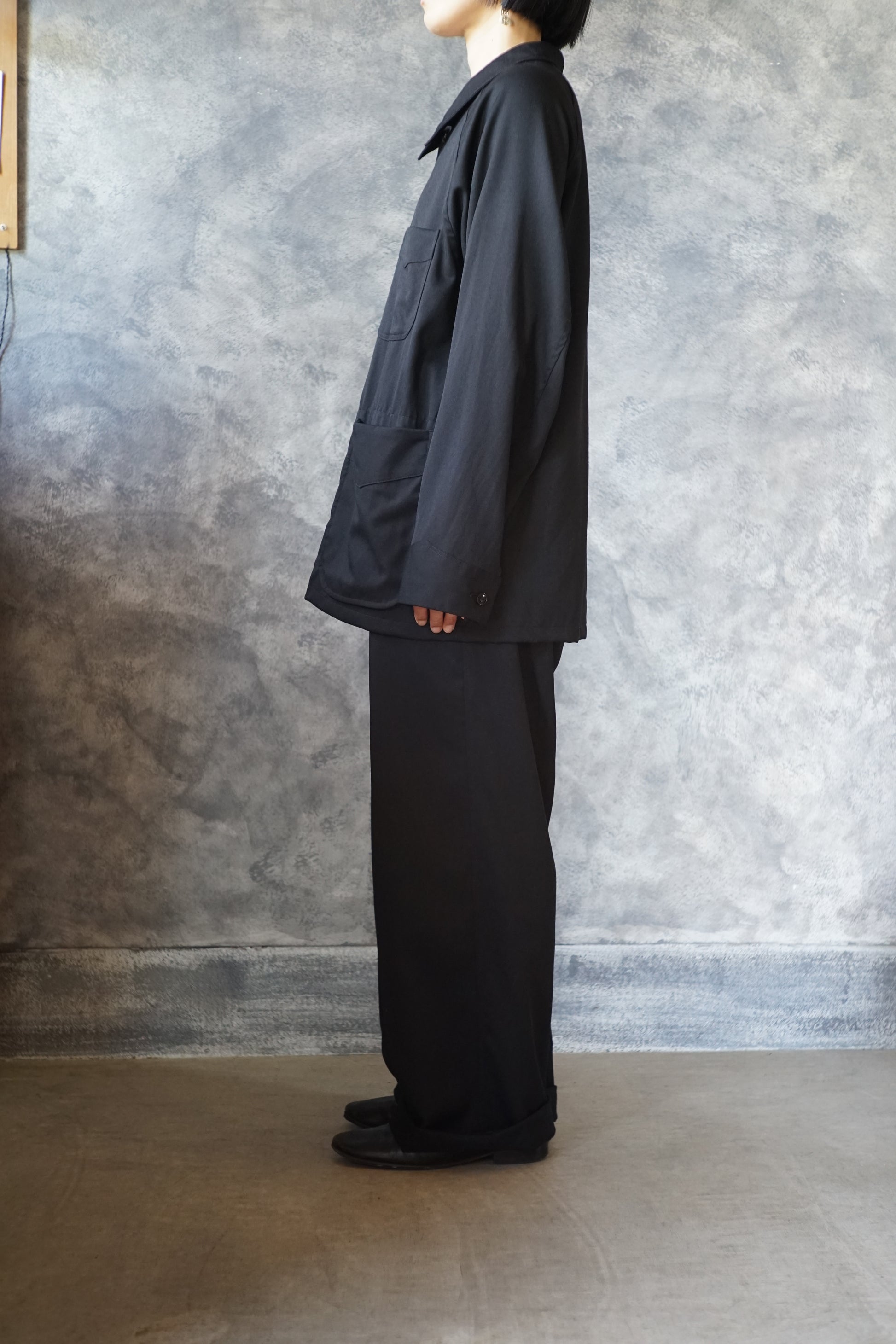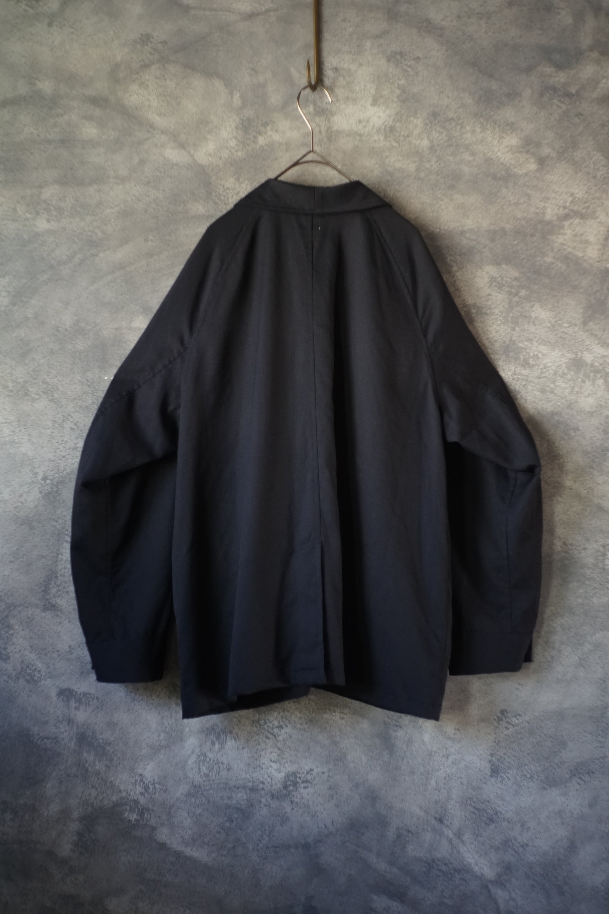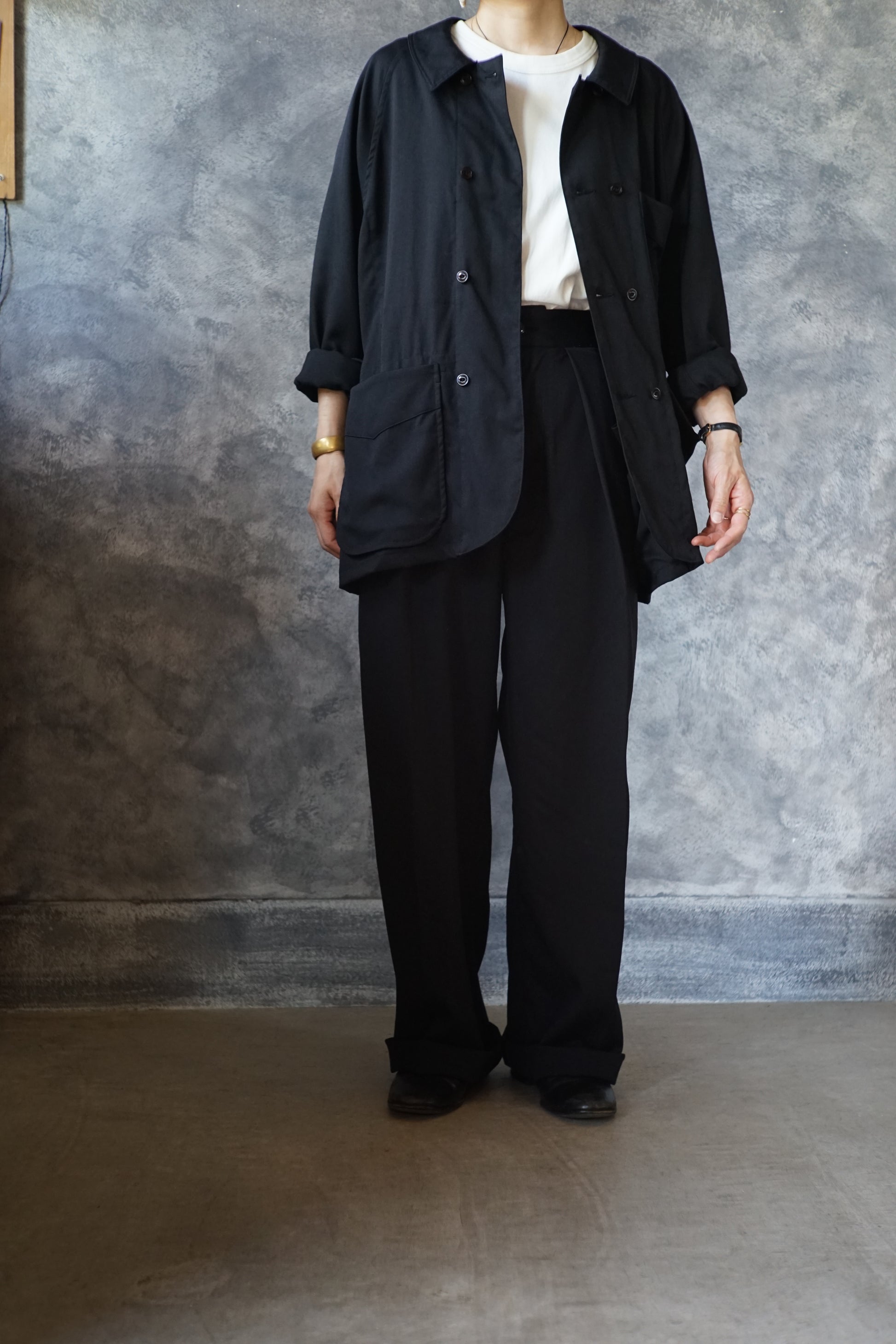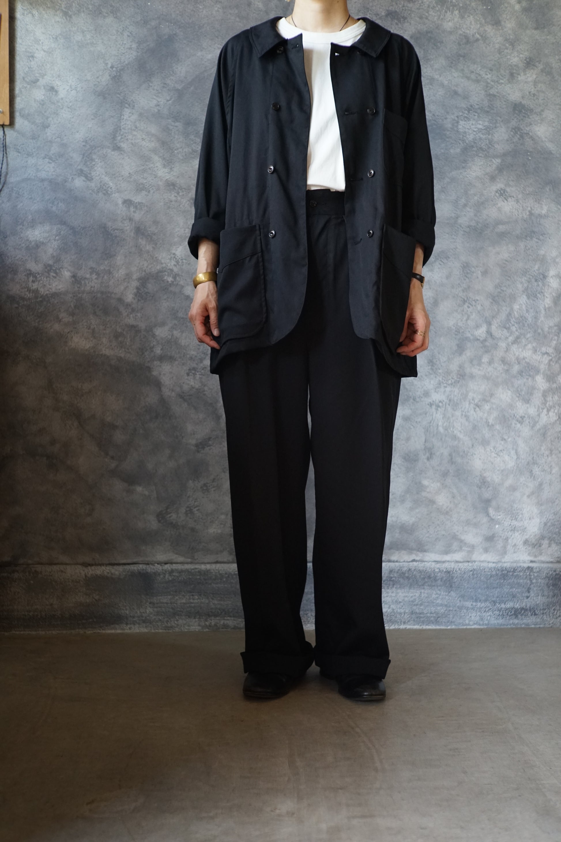 形はフレンチワークにあるような大きめでネックが下がり気味な襟の付け方は採用しつつ、フロントのダブルのボタンの合わせは開いて着たときにも野暮ったくないぐらいの重なりをイメージ。