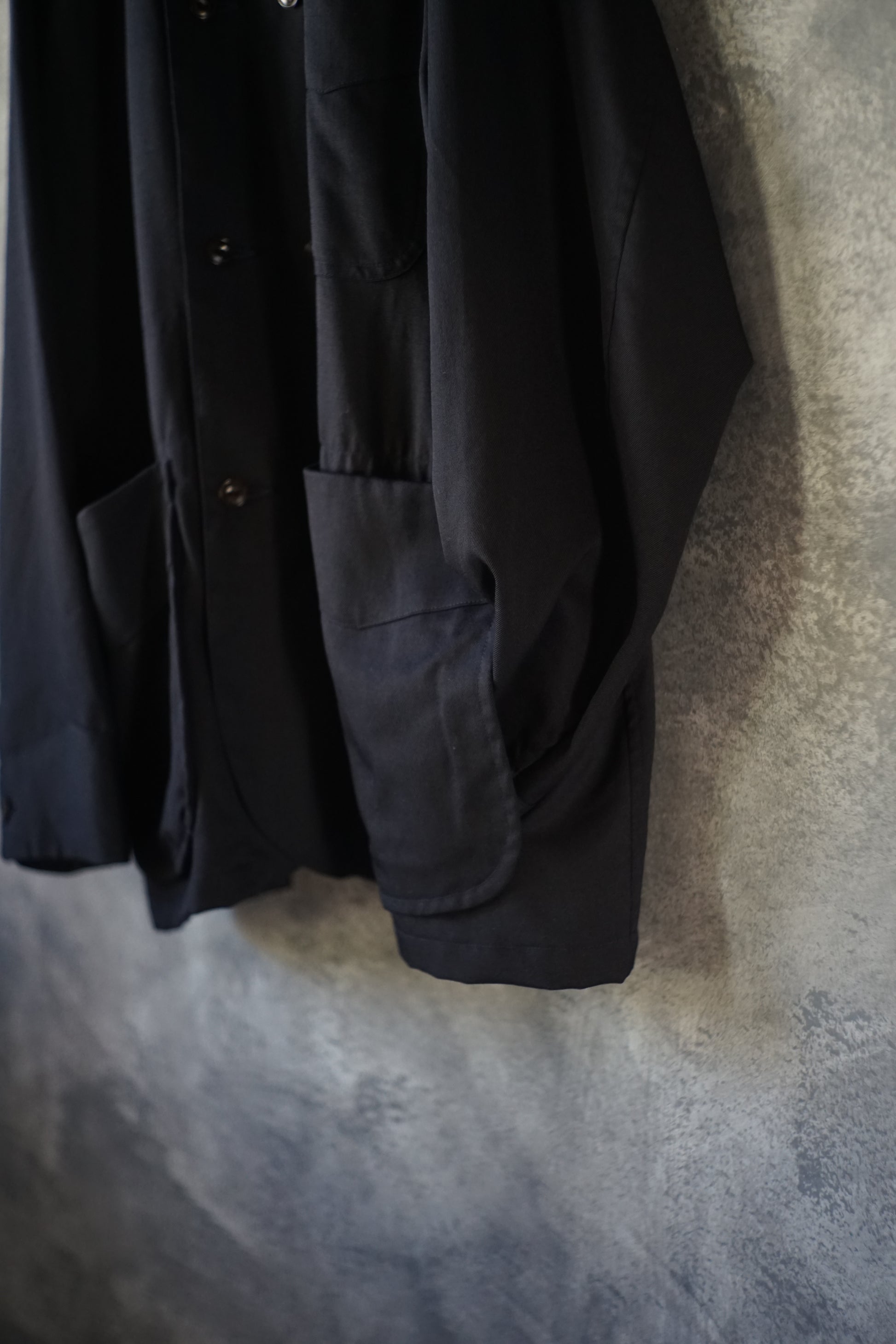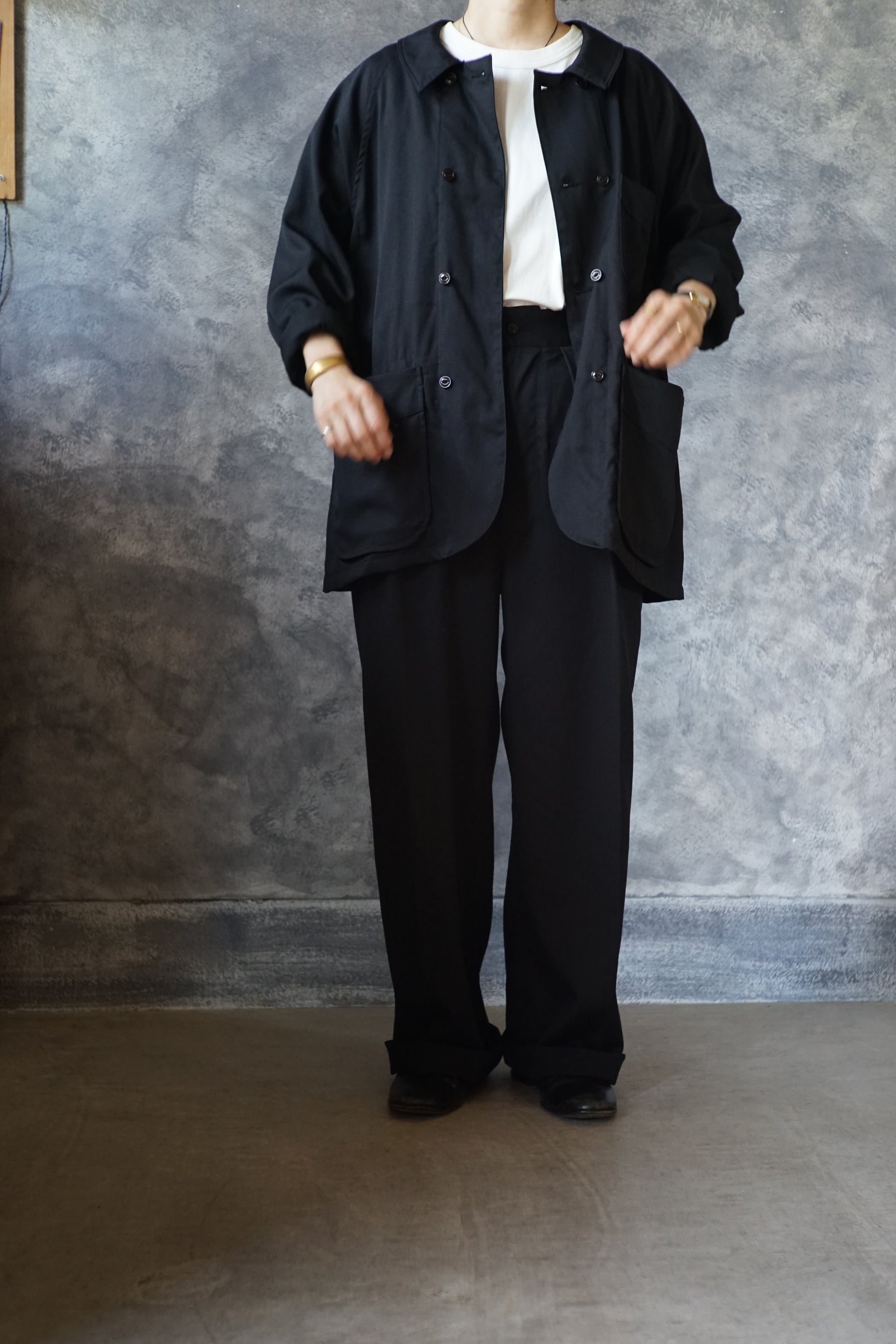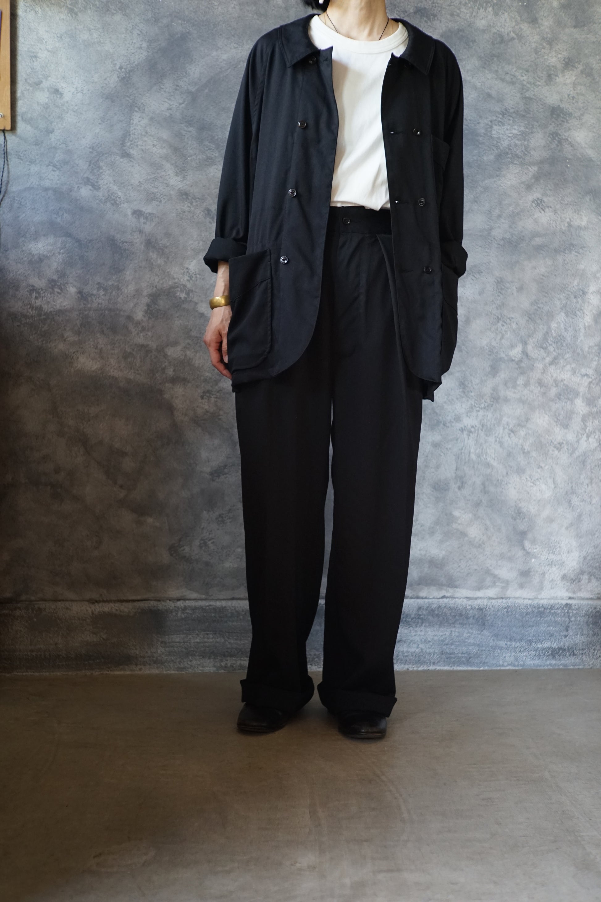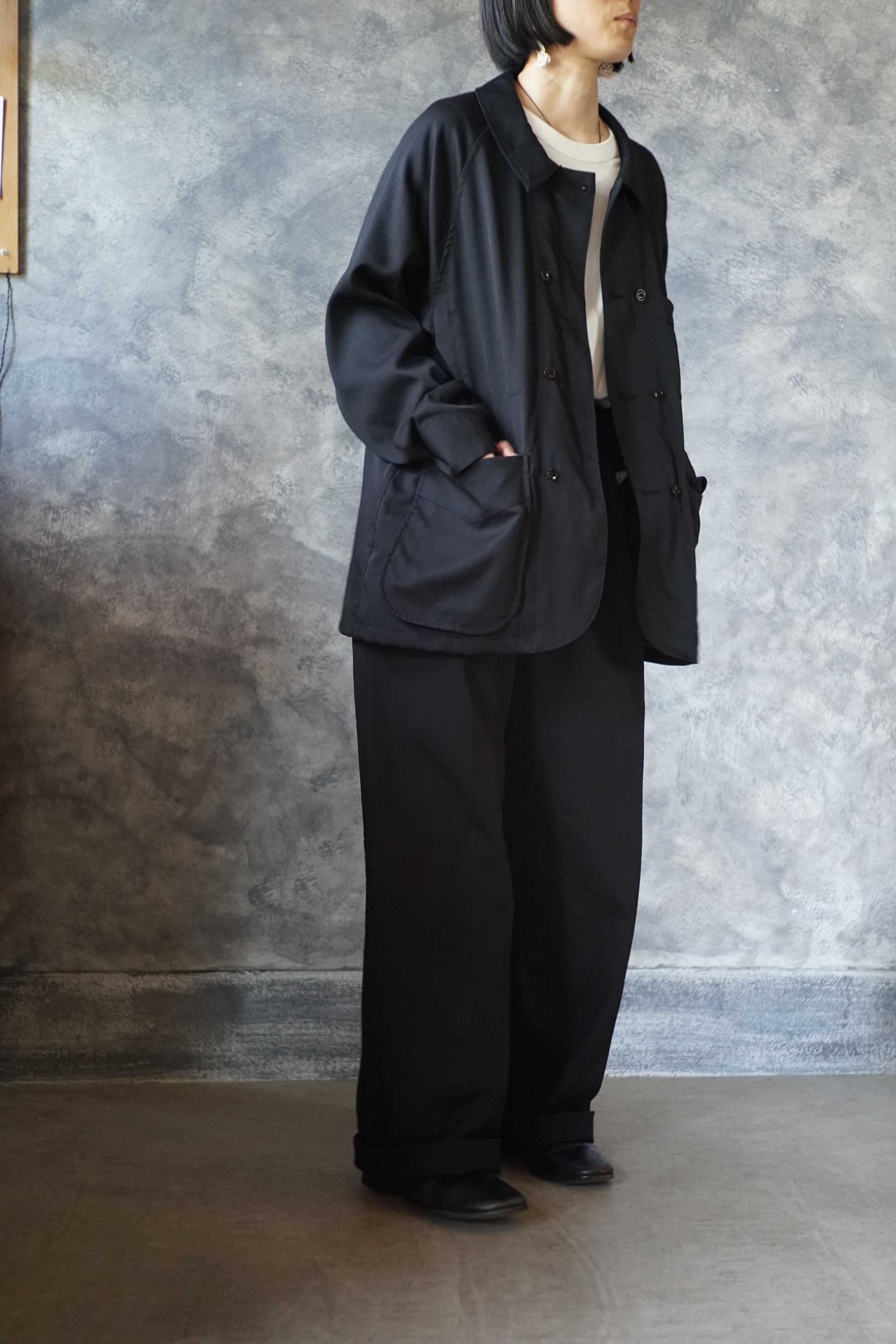 形はフレンチワークにあるような大きめでネックが下がり気味な襟の付け方は採用しつつ、フロントのダブルのボタンの合わせは開いて着たときにも野暮ったくないぐらいの重なりをイメージ。