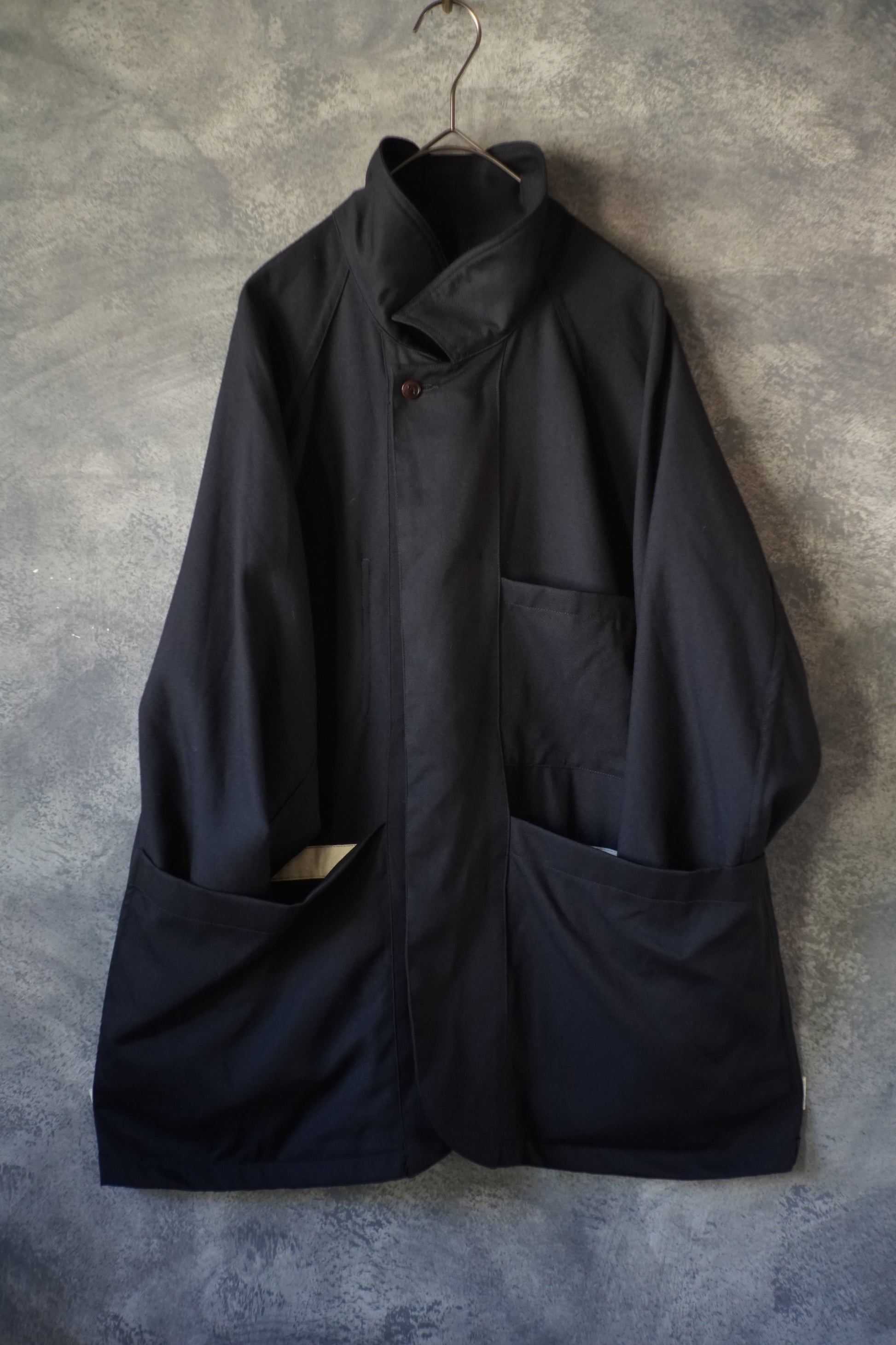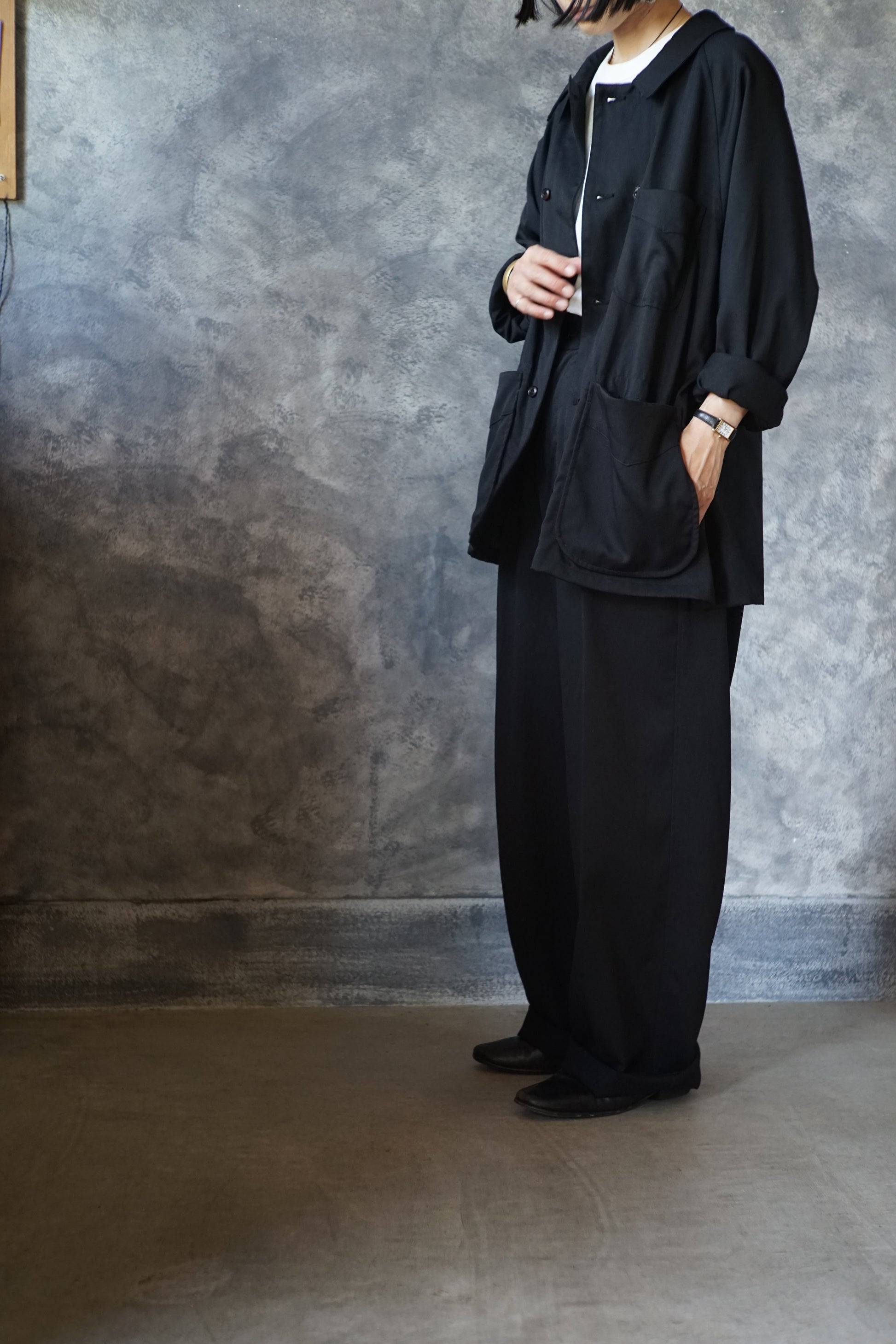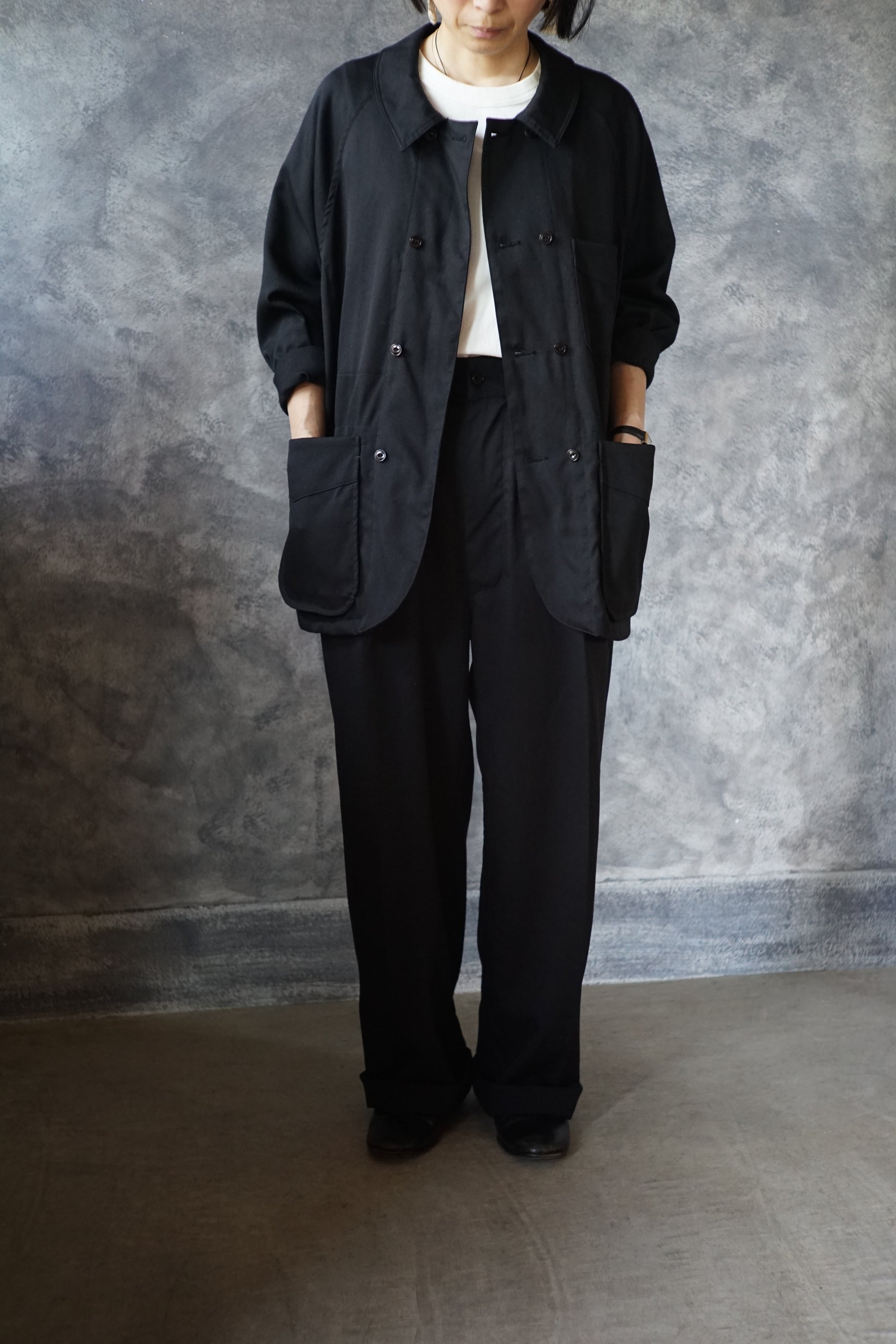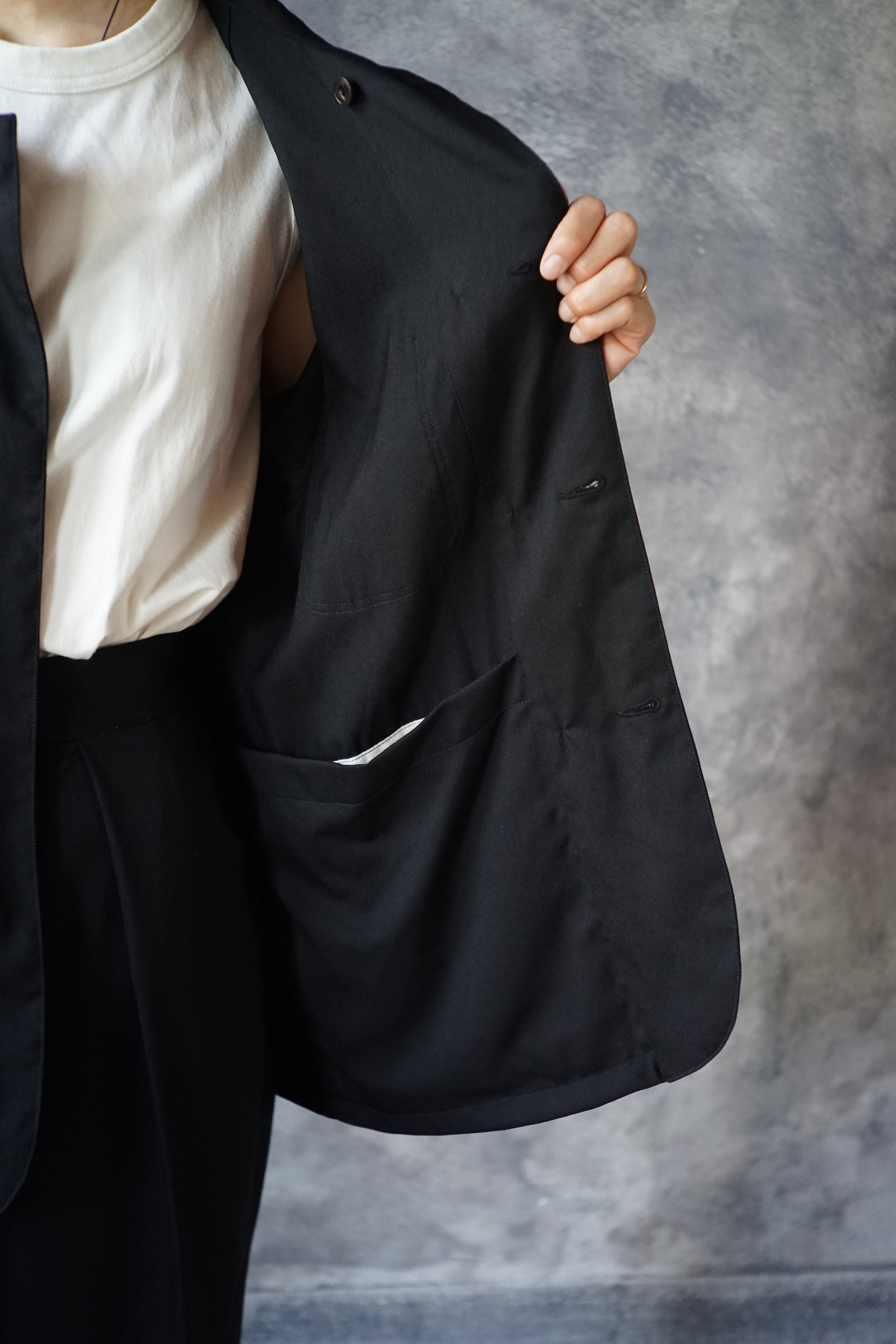 形はフレンチワークにあるような大きめでネックが下がり気味な襟の付け方は採用しつつ、フロントのダブルのボタンの合わせは開いて着たときにも野暮ったくないぐらいの重なりをイメージ。